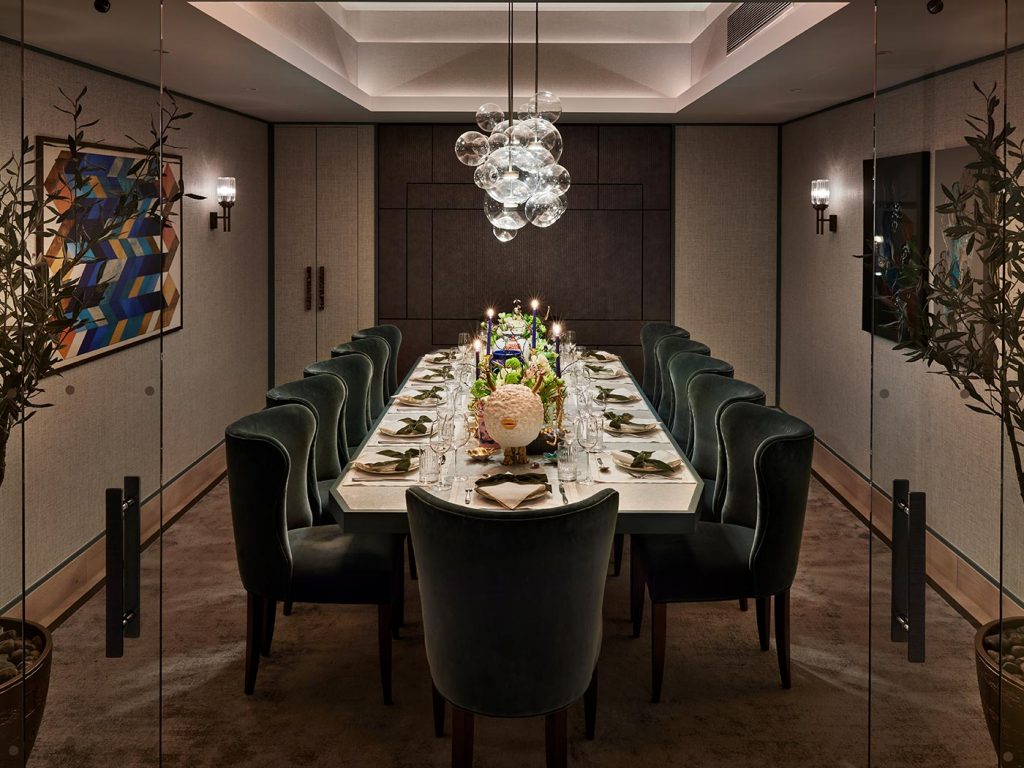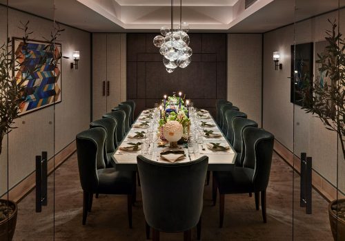 The tablescape was sumptuously styled by Alison Husbands, interior stylist at Harrods Interior Styling with a bloom, bright theme where beautiful insects and monsters played a huge inspiration. A curation of monsters by L’Objet Haas Brothers, mushrooms by Lladro, decorative leaves by Villari & sterling silver figurines by Carrs were all placed down the centre of the table to create different heights and to add grandeur. Harrods Interior Design collaborated with florist Yoko Blooms, creating the bright, sunny pastel bouquets with Etro vases & Porcelain urns by Richard Ginori to match. The look was completed with two elaborate gold candlesticks by L’Objet and elegant blue stick candles.