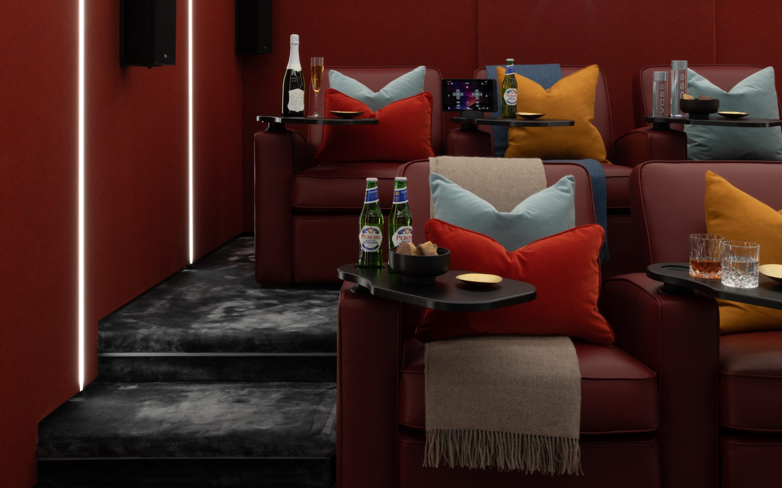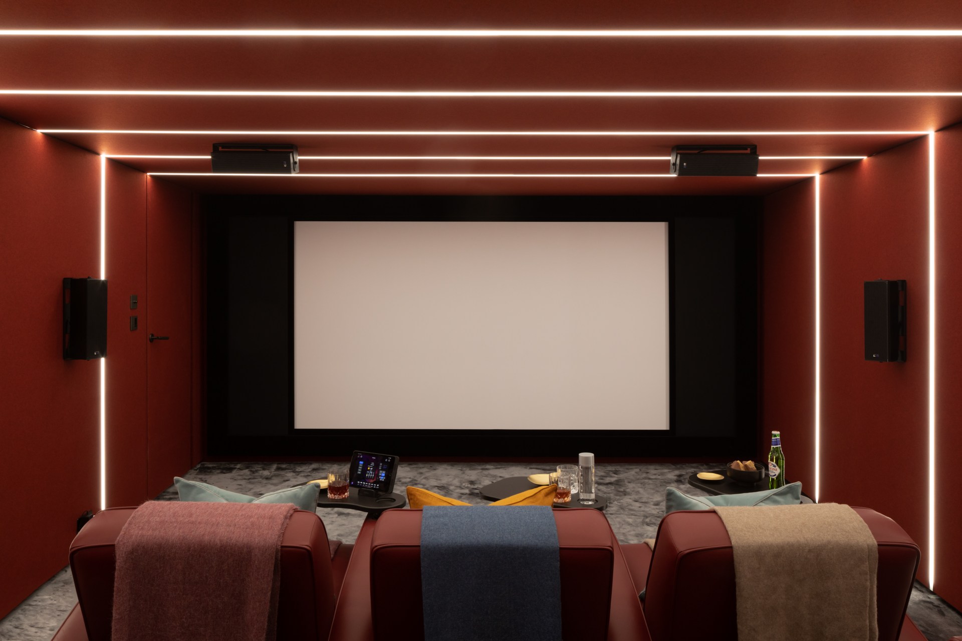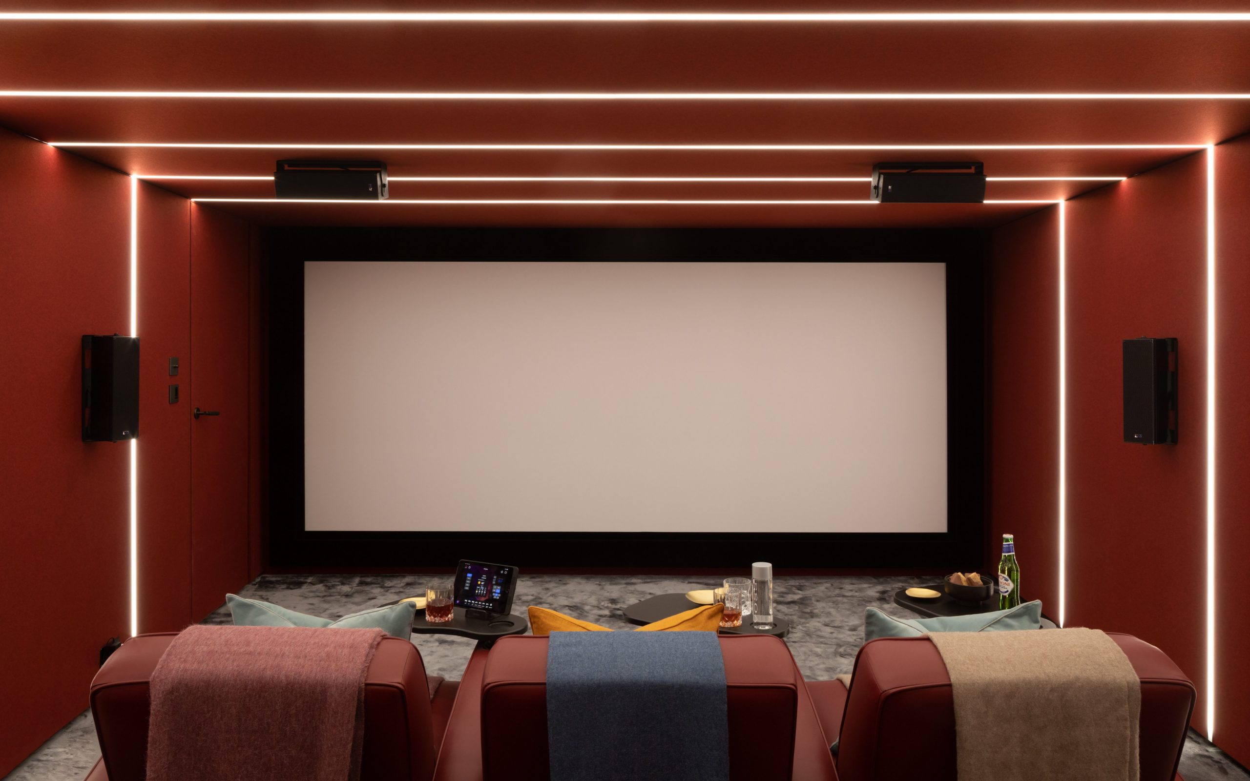 Don’t forget to lay out your snack installations to keep the room open and fresh, drawing the eye and acting as the perfect frame to the main body of your home cinema, highlighting the luxury and grandeur of the experience.