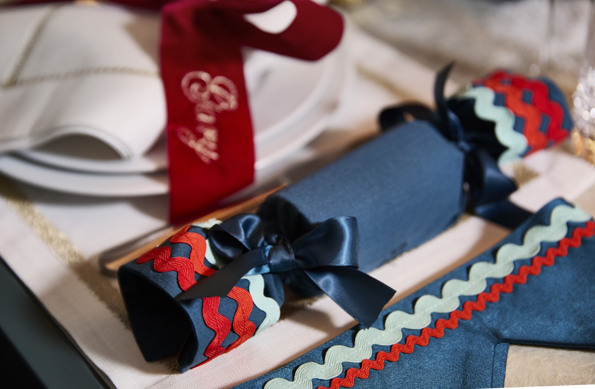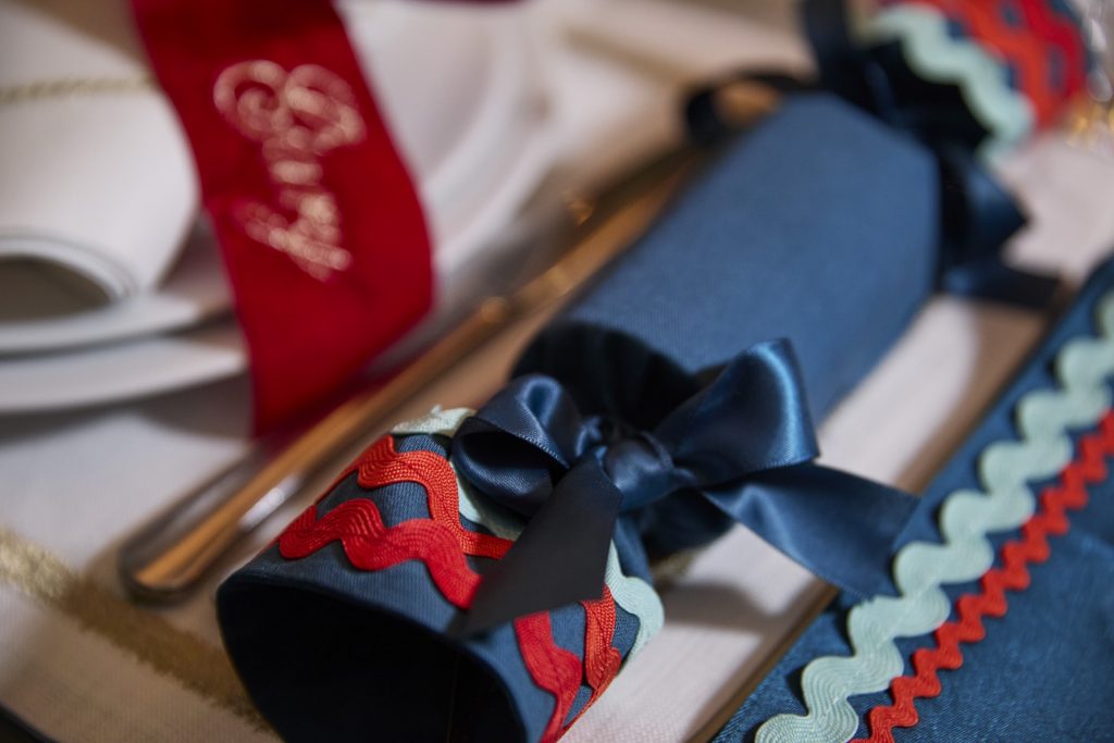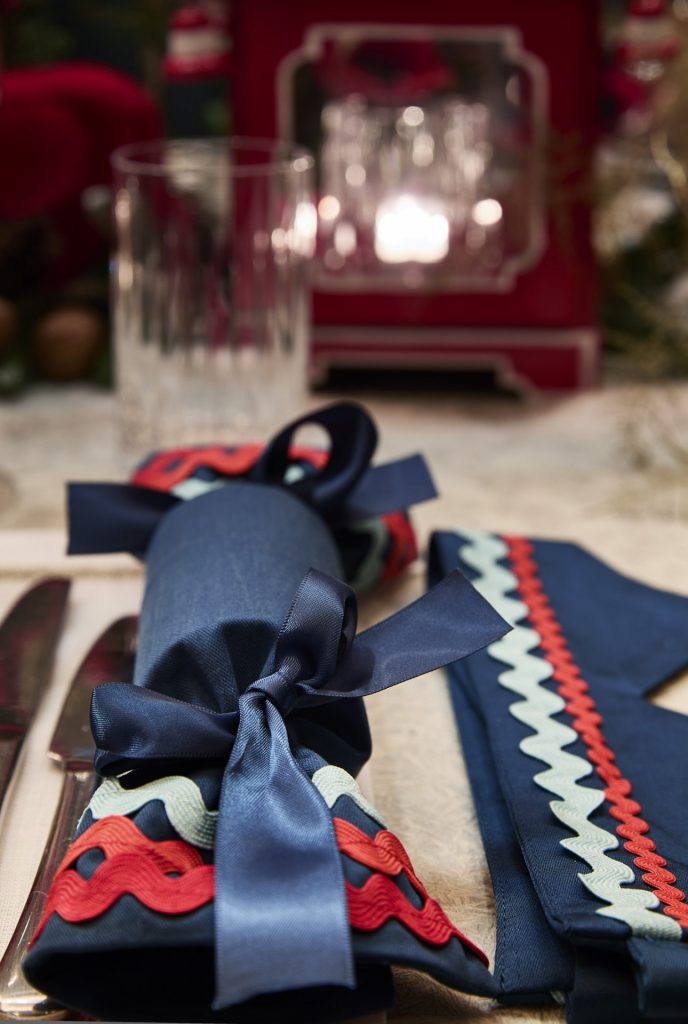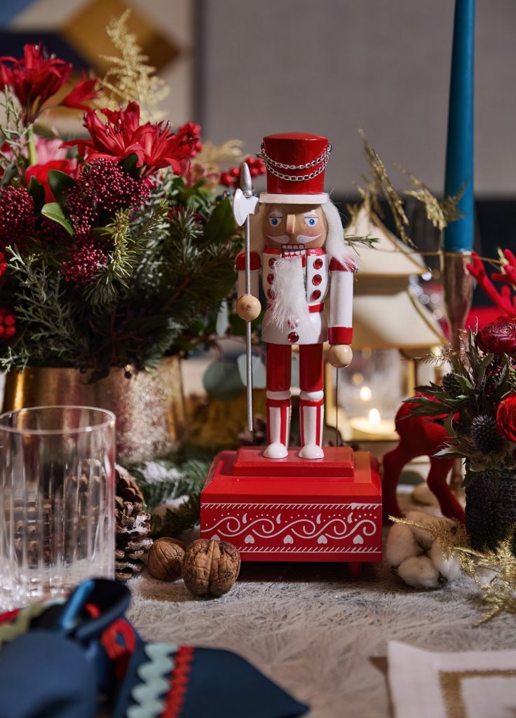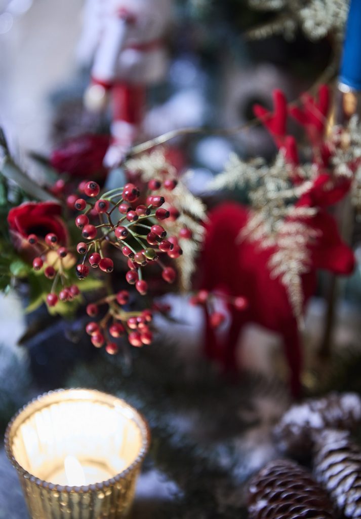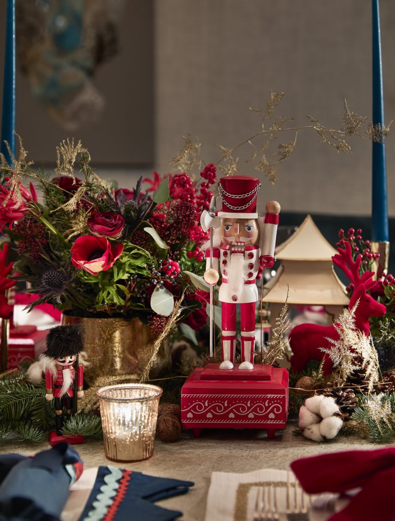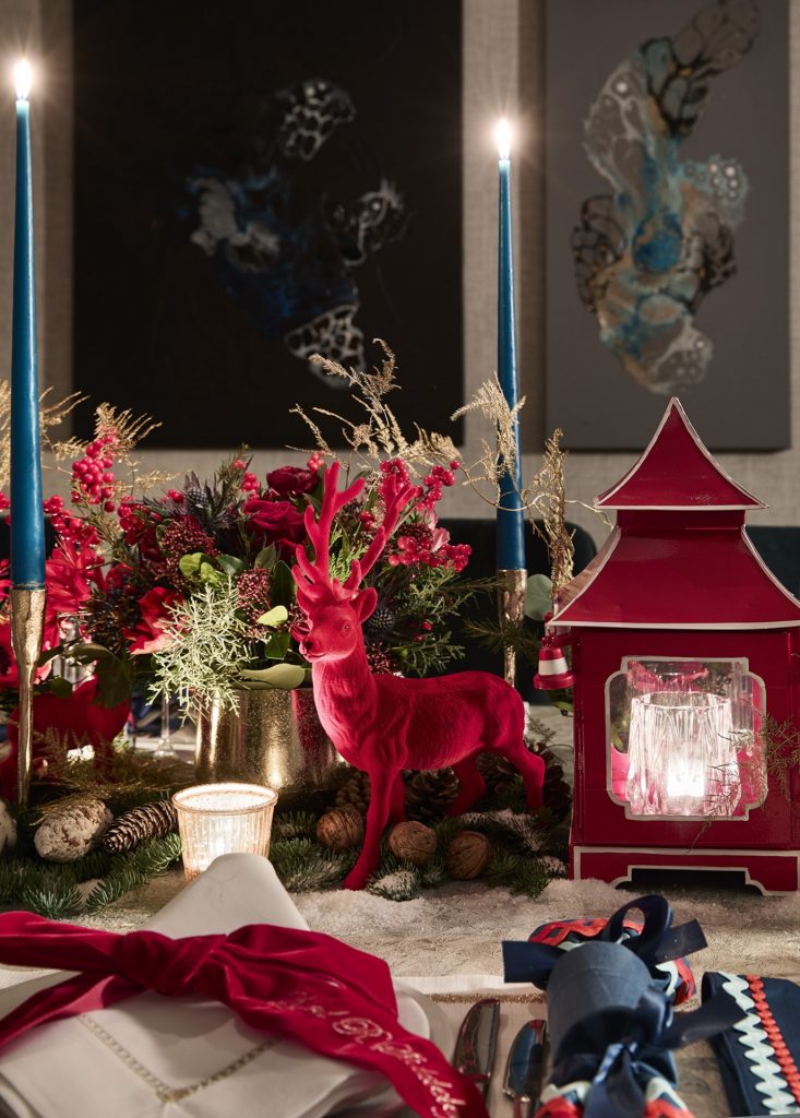 For a second Christmas table design for Cornflake, Stephenson Wright envisioned a magically festive and full display in a palette of red, cream and teal. Every place setting was dressed in reusable Fortnum & Mason fabric crackers with red rick-rack trim. Vibrant red velvet bows adorned each plate with gold thread in the guests’ names. Painted Nutcracker men and flocked reindeer added a traditional and whimsical feel, alongside sprinkles of snow, clusters of walnuts and berries. Our excellent florist Yoko provided a bed of foliage and cotton tufts mixed with gold ferns and pinecones; she understood the brief perfectly, and we were thrilled with how dense and magical the flowers and greenery looked. We like to introduce layers of natural Candlelight; tall, tapered candles in teal, small tea lights in silvered glass, and our favourite, Mrs Alice Pagodas, in two sizes, which added the variation of height to the tablescape.