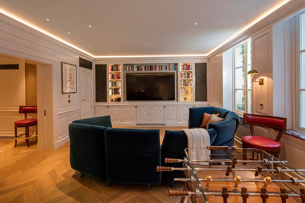 With the space for this state-of-the-art 15-seat home cinema excavated and ready for the next stage, we designed all the AV/ IT and control services for the IMAX, coordinating with the IMAX-TCL team in China. This was in order to meet specific IMAX brand standards. We installed the IMAX 7.2 audio system, the proprietary audio configuration for surround sound in addition to the full height and width IMAX dual projection system with image monitoring and automated calibration.