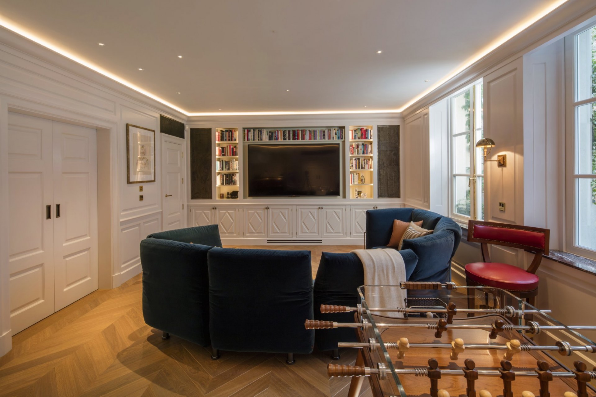 Working closely with the interior designer, we created a tiered seating arrangement with all seating positions specifically configured to have a clear, unobscured view of the screen. Cinema room finishes, including stretched fabric walling to conceal the speakers were designed in collaboration, as were the acoustic treatments to optimise audio quality and sound system performance for all seating positions. Cornflake was the winner of Best Home Cinema over £340,000 at the 2018 CEDIA Awards for this project.