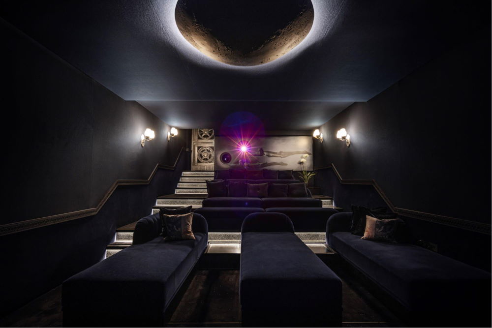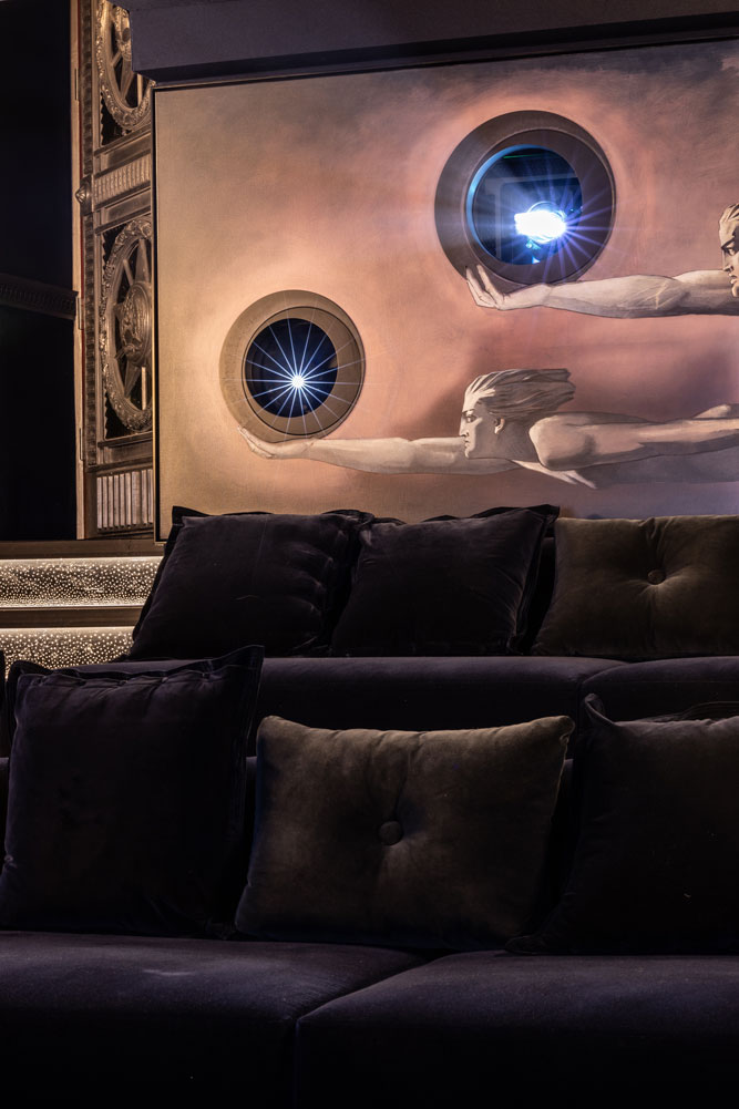 For this project, we installed a WiFi and data network, together with Lutron smart lighting. We also developed a personalised Cornflake app with an easy-to- use graphic user interface that was custom-designed for this property, where all automated aspects can be controlled and adjusted using fixed or roaming iPads, or remotely via a smartphone or tablet. We installed a DCI (Digital Cinema Initiative) projector by Barco to stream content direct from Picturehouse Cinemas. The cinema also includes an anamorphic lens control to switch between native 2.35: and standard 16:9 TV viewing. To add to the immersive atmosphere of the design, this optical port lens for the projector shines into the screening room, like a star in the night sky.
